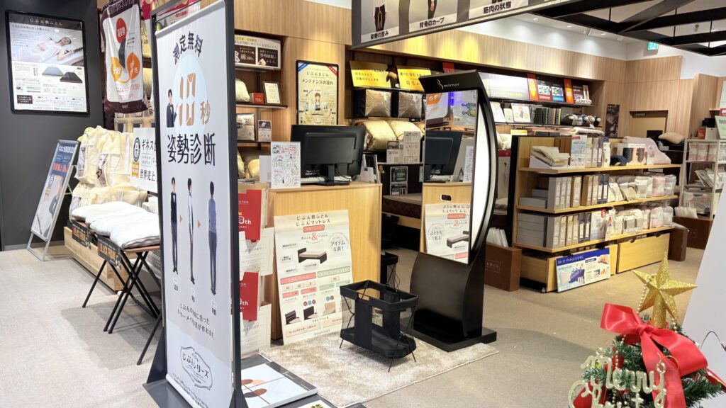 「じぶんまくら」では、専用の測定器(例:非接触型「IBMirror」など)や立位測定器を用い、一人ひとりの体型を数値化・可視化して枕設計を行います。
