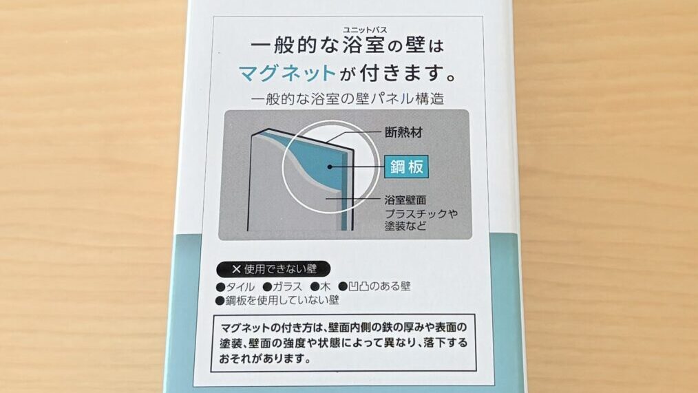 タイルや樹脂壁など、マグネット非対応の浴室では貼り付けできません。