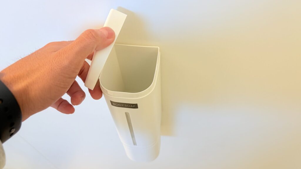 マグネットディスペンサーは広い間口で、シャンプーなどの詰め替えパウチの中身をそのまま注ぎやすい構造です。